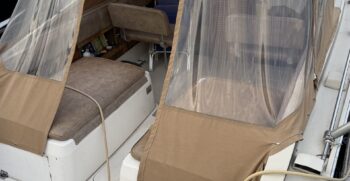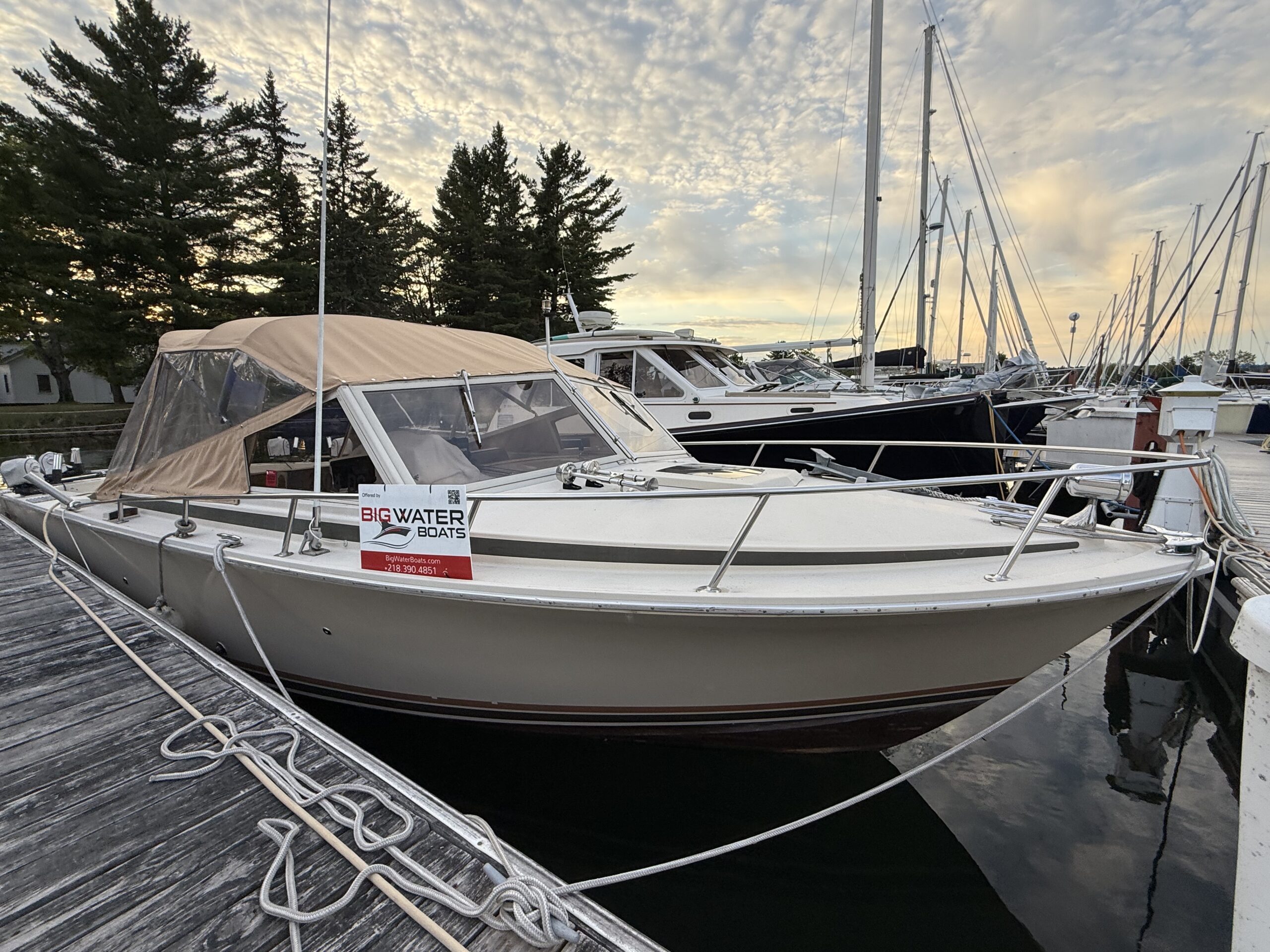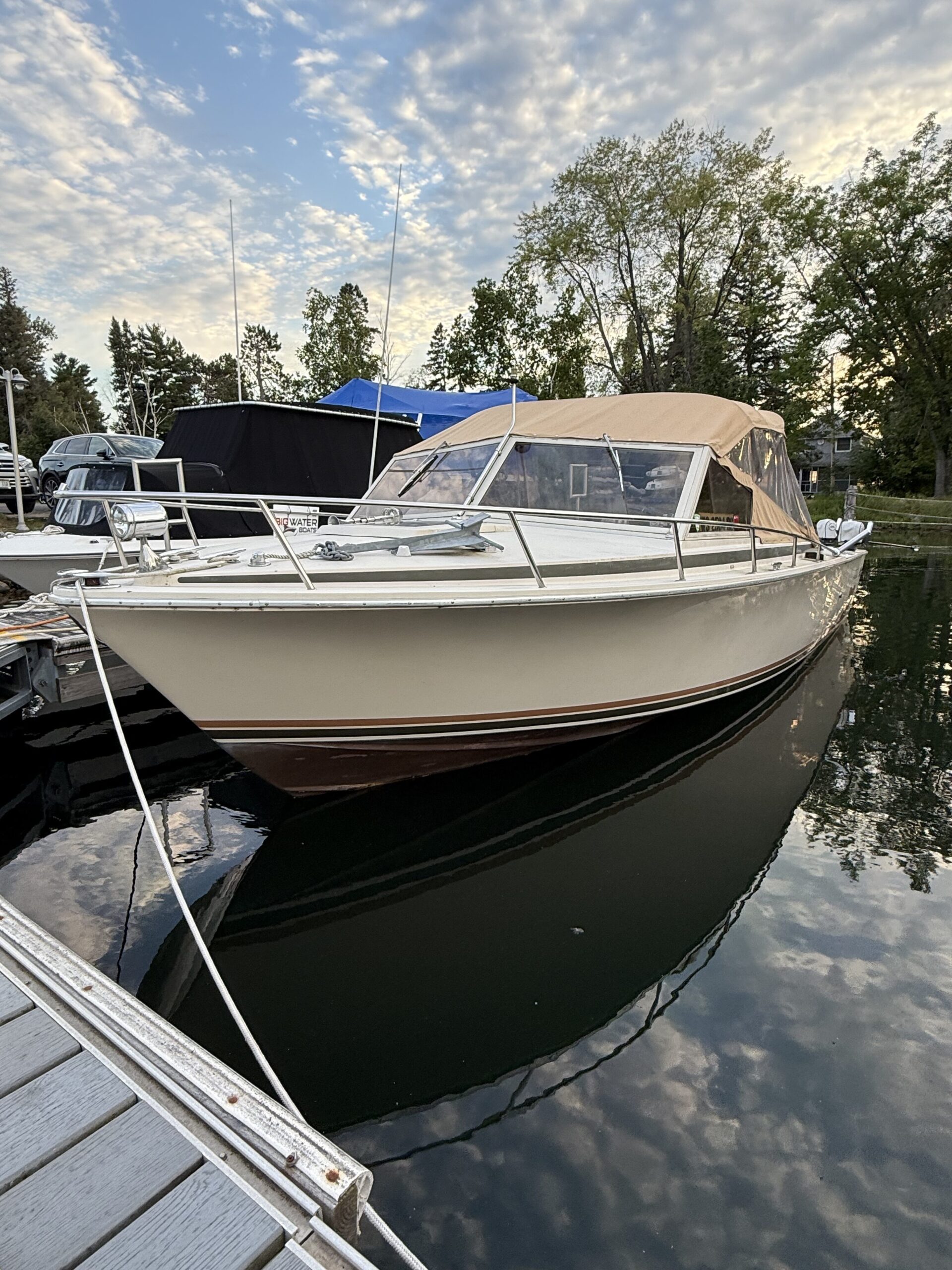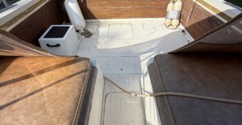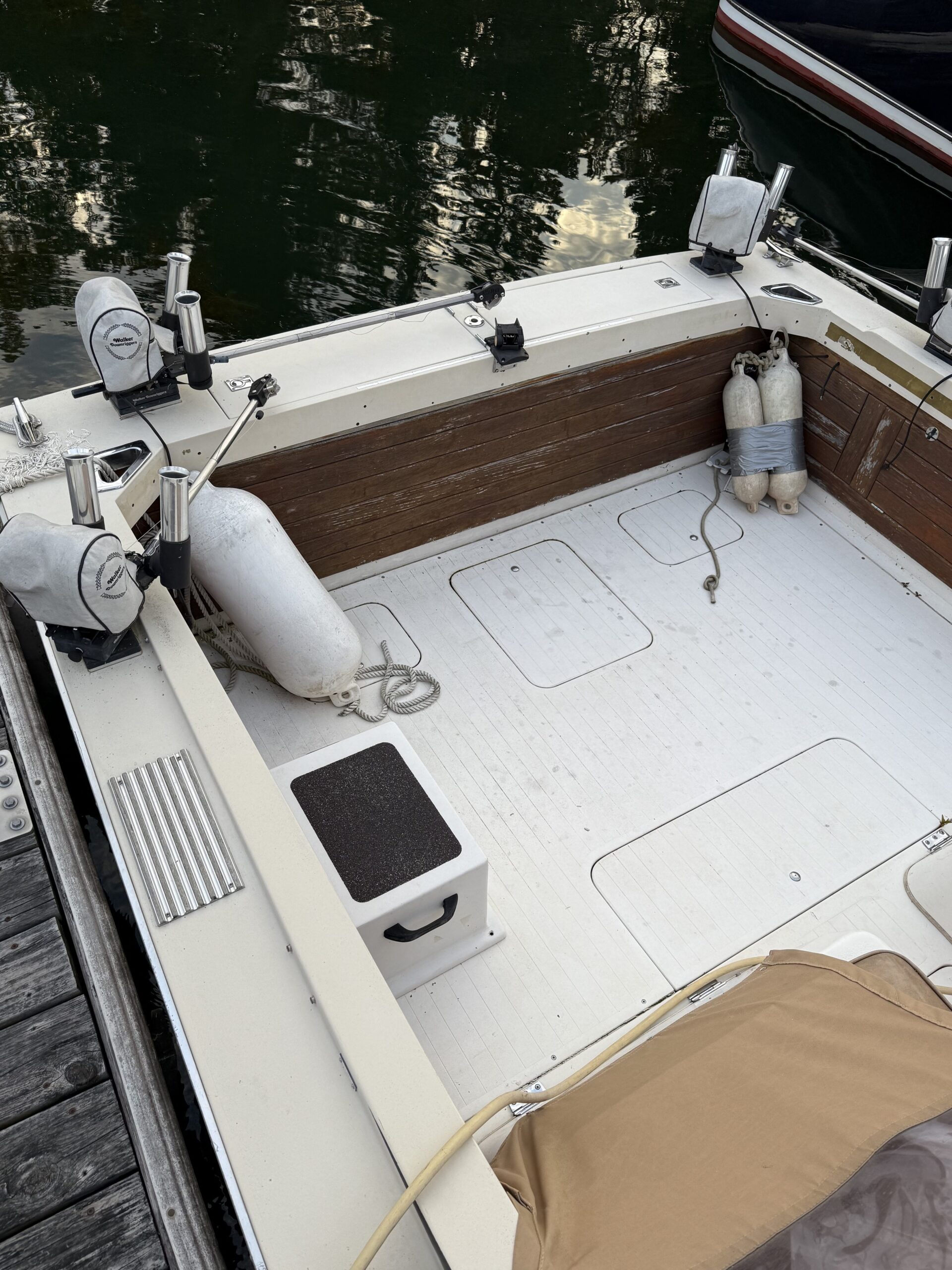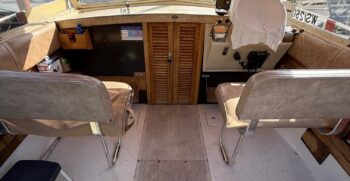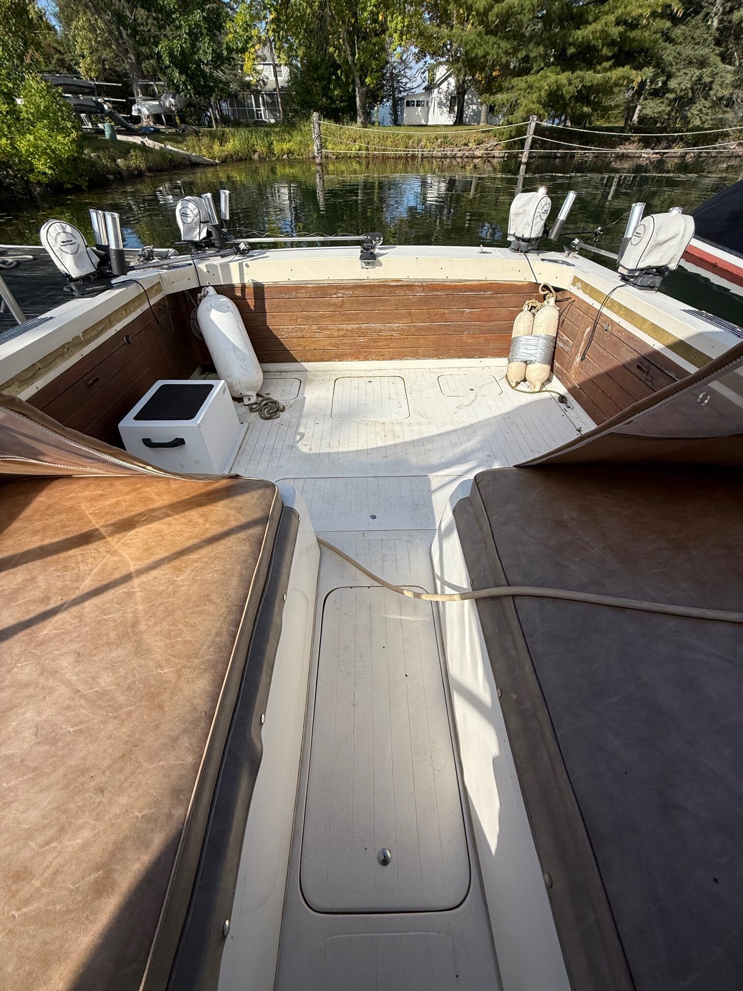 Open cockpit design with outboard enclosed storage lockers. Four deck hatches in fiberglass cockpit. Dual engines hatches with pass through going forward. To starboard is storage cabinet with DC refrigerator and drawer. The bench helm seat is forward and has a sink underneath accessed by folding the seat. Helm controls and electronics fwd. To port forward of the engine hatch is the collapsible dinette with bench seats fwd and aft.  Storage drawer fwd. Bilge access hatches in deck. Louvered teak door open to the Vee berths with cushions and filler for a queen sized berth area.  Under filler is a porta potti (that has a deck fitting for dockside discharge). Storage hanging lockers and overhead Deck hatch with screen. Forward is the rope locker access.