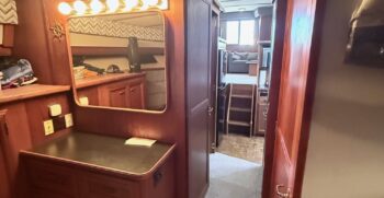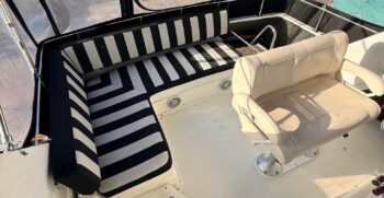 The Carver 42 Cockpit Motor Yacht has a spacious command bridge featuring comfortable seating for eight adults, arranged fore and aft of the walk-around command console. Skippers will appreciate the intelligent layout of the console and its full instrumentation, as well as the raised helm seat which provides unobstructed visibility. A convenient cocktail table is ideal for on-the-bridge entertaining. And sun lovers will enjoy the foredeck double-width padded sun lounge, accessible by wide walk-around side decks. Owners and guests will also enjoy the roominess of the 42’s large cockpit. A full 7 x 13-foot area provides the perfect environment for all types of open-air entertaining and dining. Belowdecks, the 42’s plush main cabin resembles a luxurious hotel suite, with color-coordinated carpeting, upholstery and draperies, plus hand-rubbed teak bulkheads and trim. Its salon features a comfortable sofa-lounge which converts to a double berth; a pull-out gateleg dining table and cocktail table; a lower-station helm with designer wheel and anodized aluminum control panel; bar area with ice maker, bottle and glass storage; and a beautifully hand-crafted teak entertainment center with a stereo components. The 42’s fully equipped galley would delight even the most sophisticated chef, and features a double-door refrigerator, a deep double-basin stainless-steel sink, flat top and combination convection- microwave oven with exhaust hood, and abundant counter and storage space. The 42 Cockpit Motor Yacht sleeps six adults in comfort with luxurious accommodations. The master stateroom forward features a choice of a large double berth or V-berth, two large hanging lockers, and convenient cabinet and drawer storage. In addition, the stateroom provides private access to the fully equipped head compartment. The midship stateroom offers two twin beds and an all-in-one washer/dryer. Finishing touches to this one-of-a-kind motor yacht include rich teak parquet flooring in the galley and head compartment; imported Italian sinks, hardware and fixtures; and a walk-in engine compartment for easy servicing.