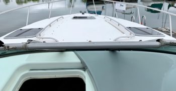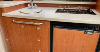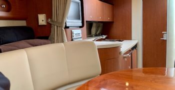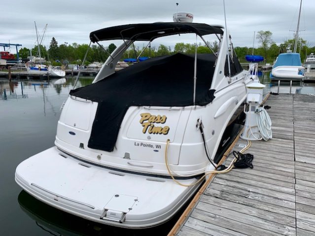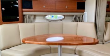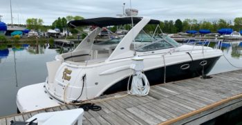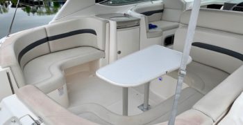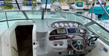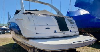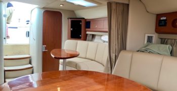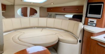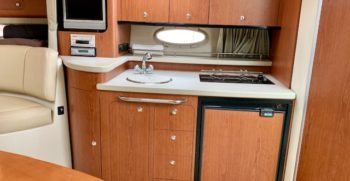 Crisp styling, tasteful cabin accommodations, and excellent performance are the hallmarks of Chaparral’s Signature 330. This is an upscale family cruiser whose quality features and exemplary fit and finish are apparent to even inexperienced boaters. Built on a modified-V hull with core hullsides and generous beam, the 330’s main cabin is an appealing blend of cherrywood joinery, designer fabrics and vinyl overheads. A wraparound lounge with a table forward converts to a big V-berth, and the 330’s private midcabin is notable for its partial standing headroom, entryway door, and built-in vanity with sink, mirror, and upholstered seat. The galley, with its faux-granite surfaces and stainless steel sink, has enough storage for a long weekend. In the cockpit, the centerline boarding door aft allows for an unusually guest-friendly seating layout. Additional features include a cockpit wet bar, dual transom lockers, a tiered, non-glare dash, generator, and an extended swim platform.