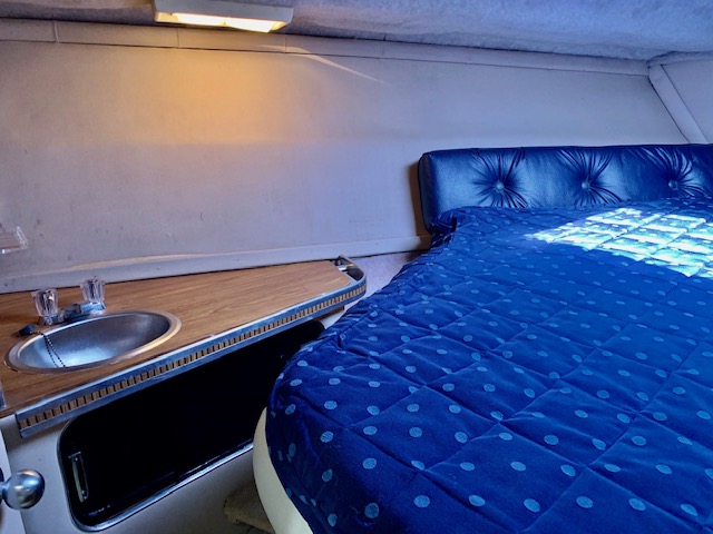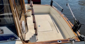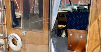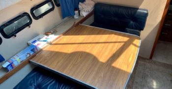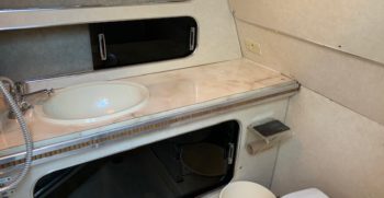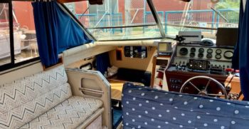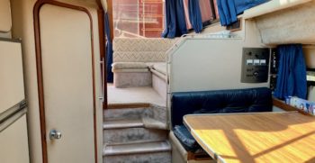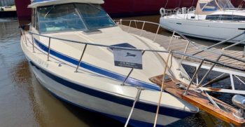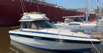 With a deep-V hull, this Chris Craft 333 Sedan is a traditional flybridge cruiser with a distinctive profile and an open cabin layout. Constructed of solid fiberglass, and a relatively wide beam creates a roomy interior with berths for six and good headroom throughout. The floorplan of the Chris 333 is arranged with the galley and dinette forward, a few steps down from the salon. A lower helm was standard, and a double berth is found in the single stateroom. Topside, the flybridge will seat three on a single bench seat. She is a good rough-water performer