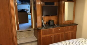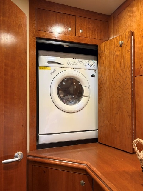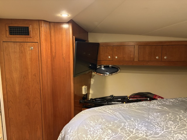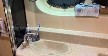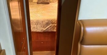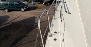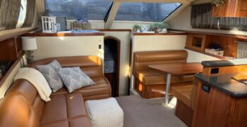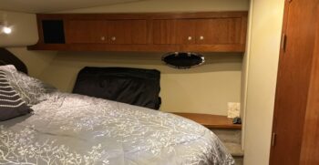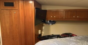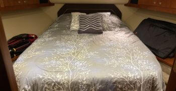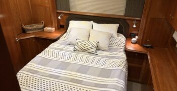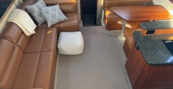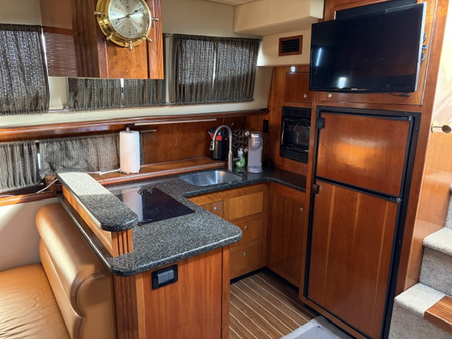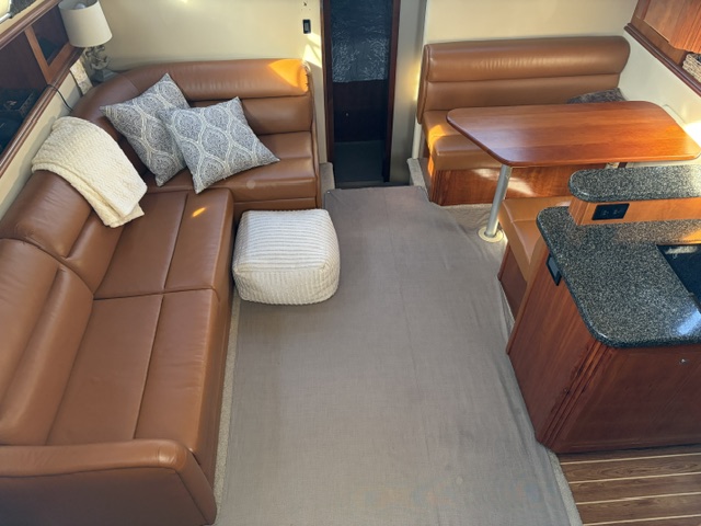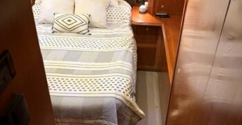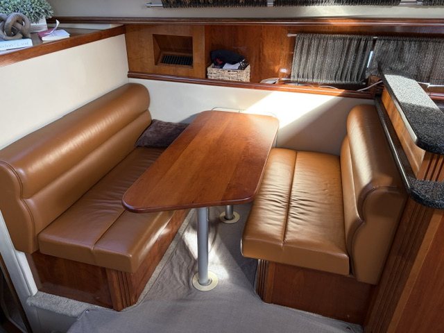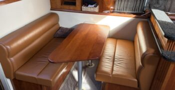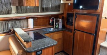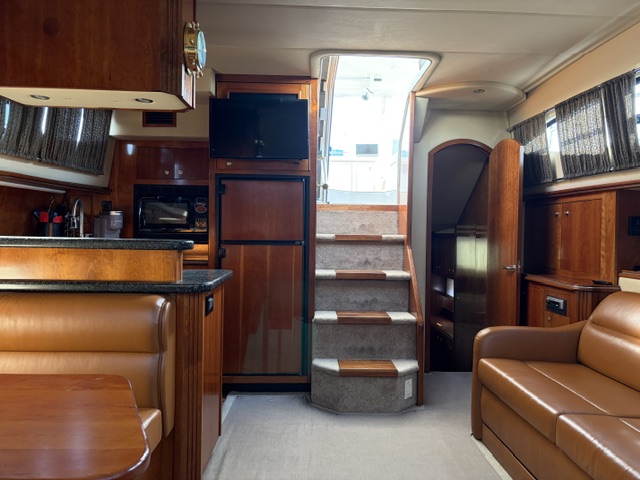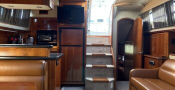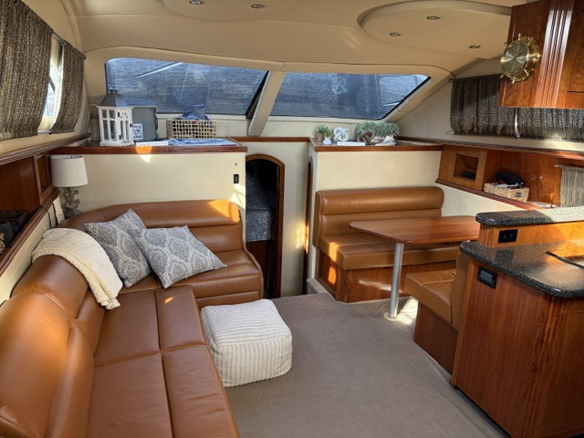 Below deck, the interior features warm cherry wood finishes and abundant natural light. The salon includes a large convertible dinette and an L-shaped sofa which also converts to a bed. The fully equipped galley offers a full-size refrigerator/freezer and ample storage.