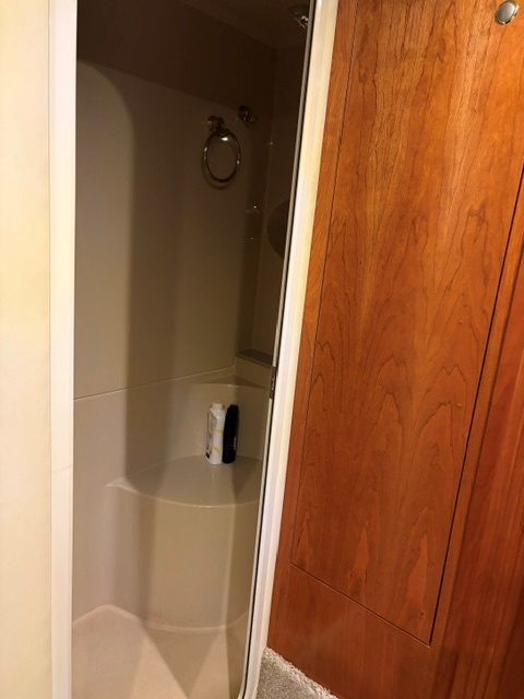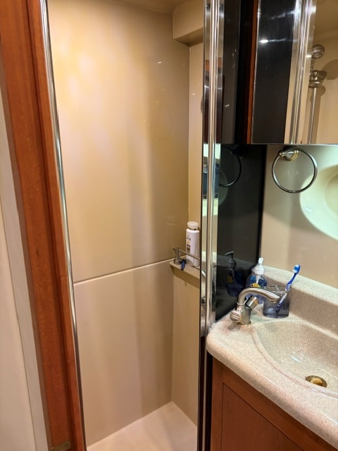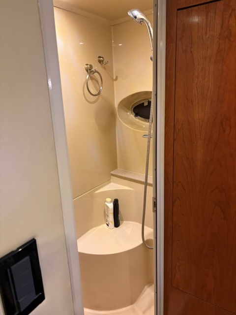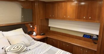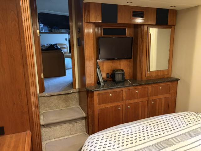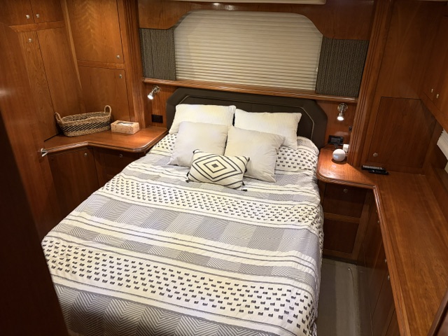 • Aft master stateroom with walk-around queen bed, private head, and separate shower