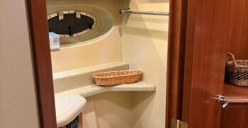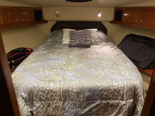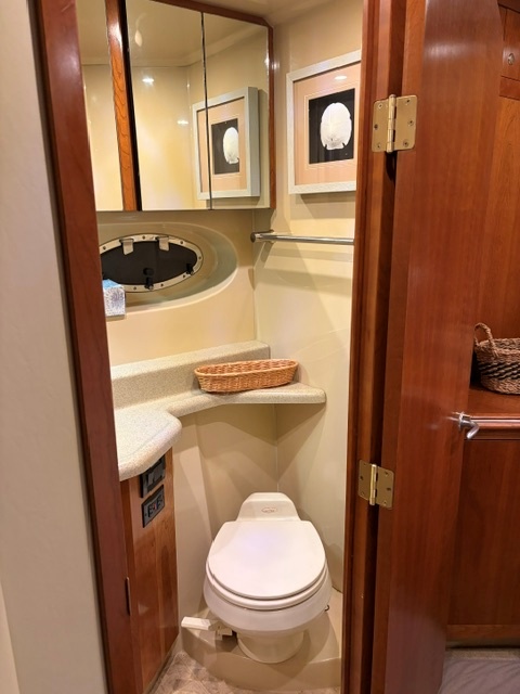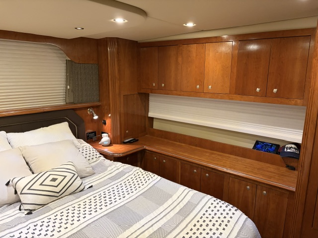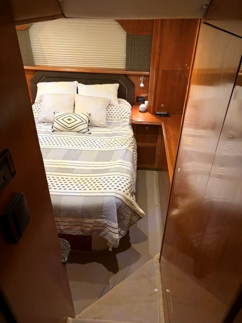 • Forward guest stateroom with centered queen berth and private head access