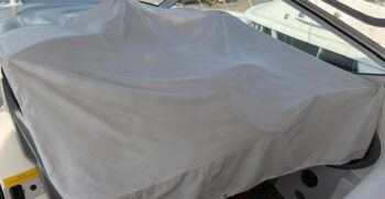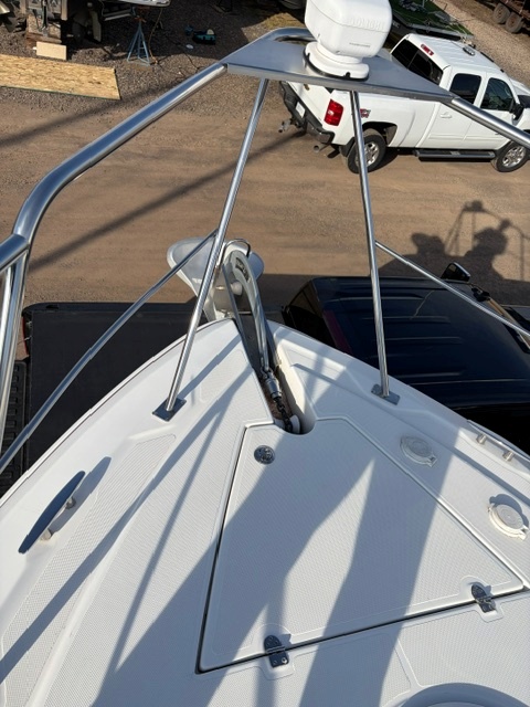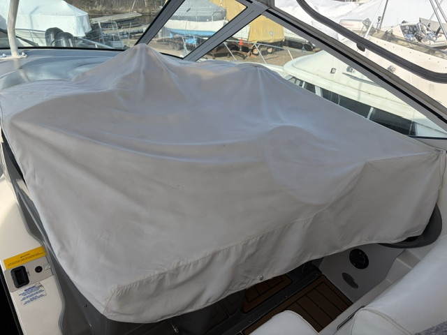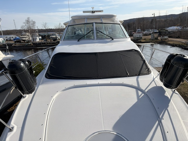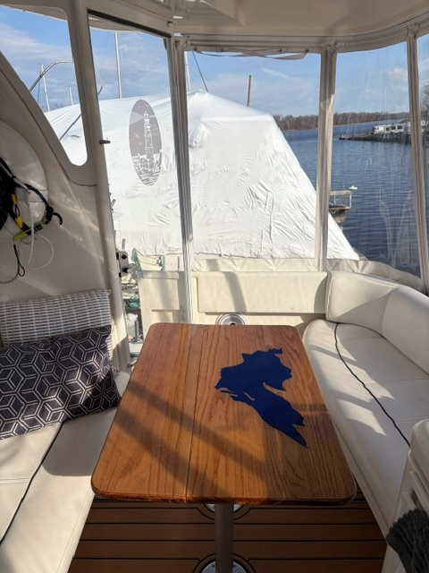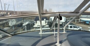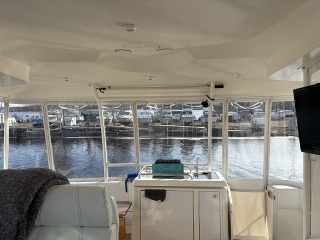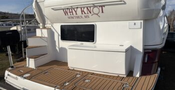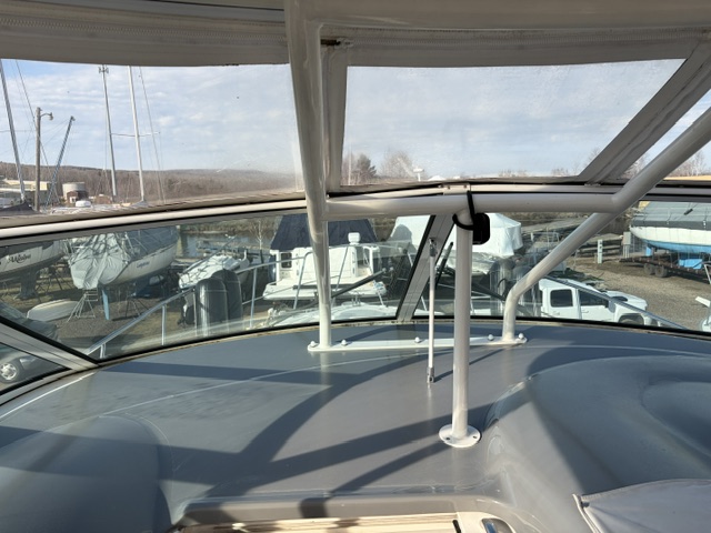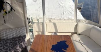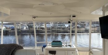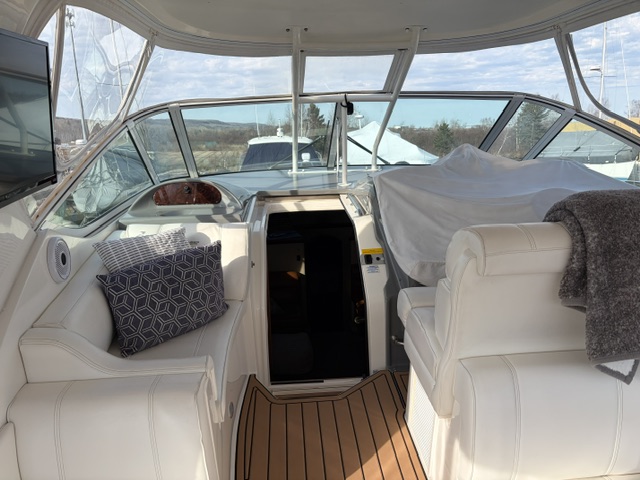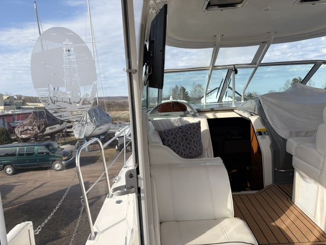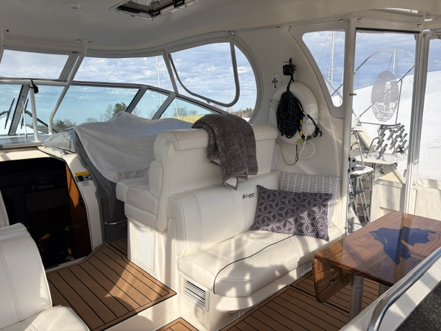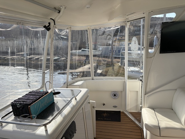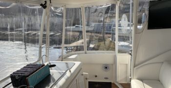 Boarding through the port-side transom door, you’ll find a well-appointed cockpit with a starboard helm, generous seating, refrigerator, sink, and an LG TV—perfect for entertaining. The seamless layout between the bridge and cockpit creates an open, inviting space, while the full windshield and hardtop with enclosure provide excellent protection from the elements.