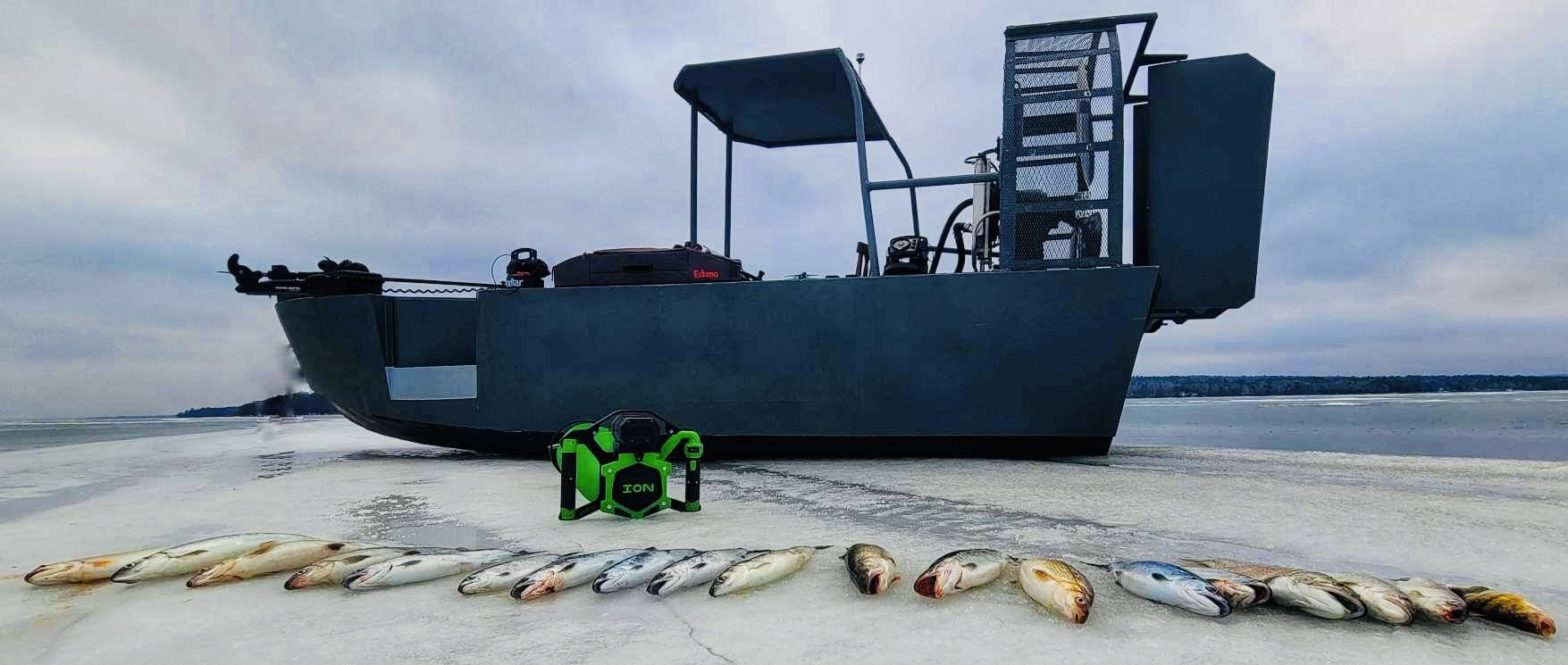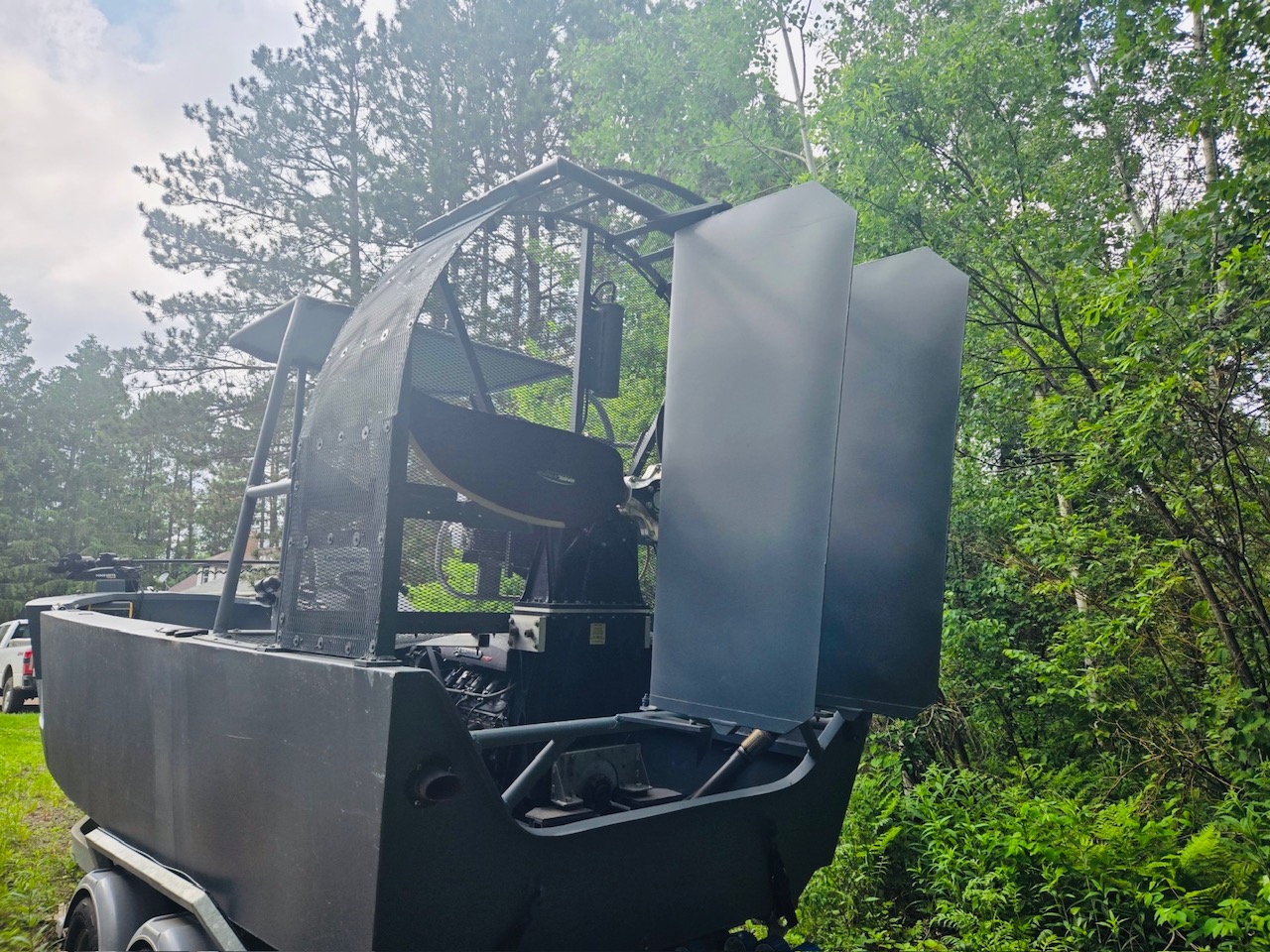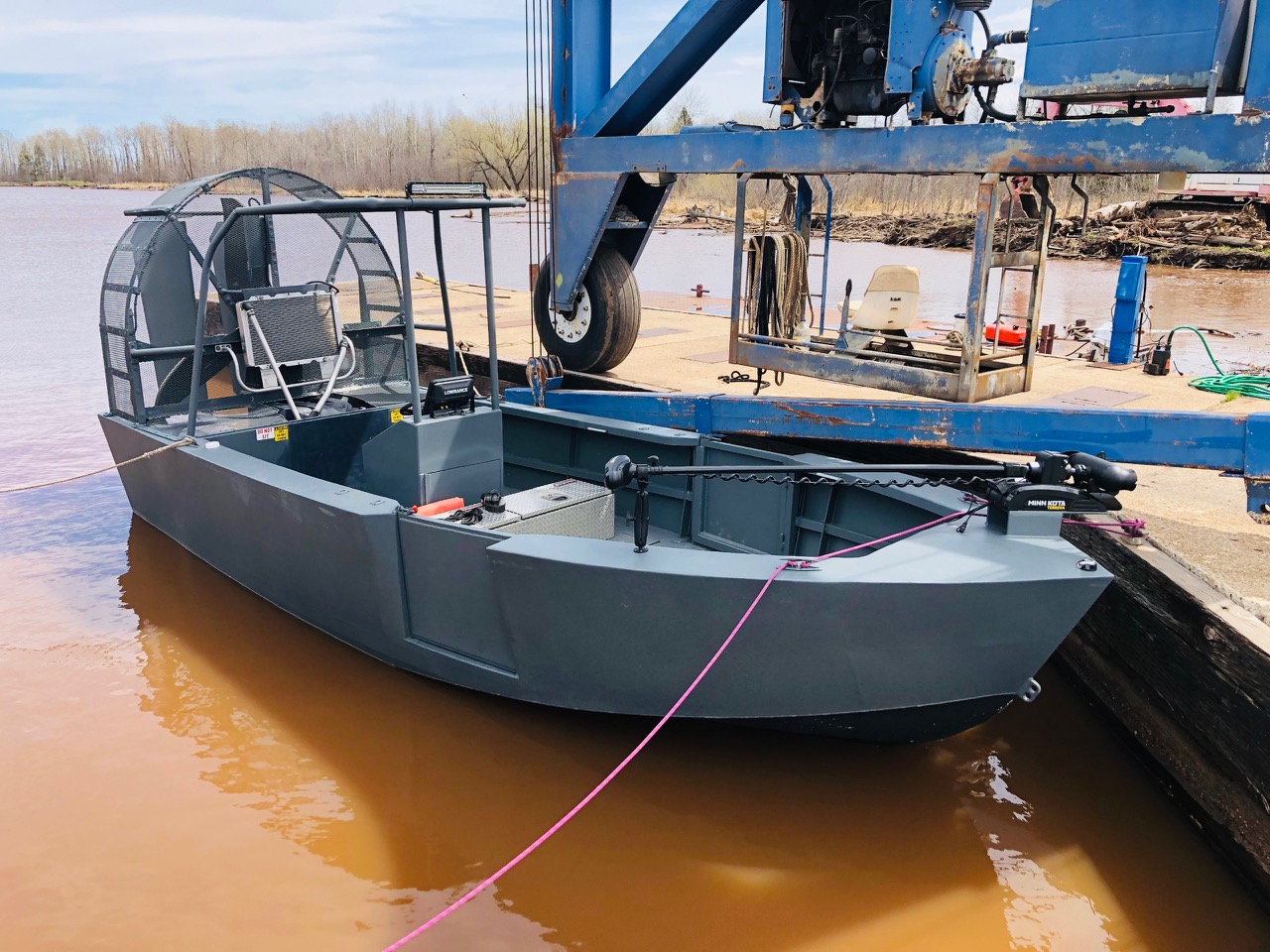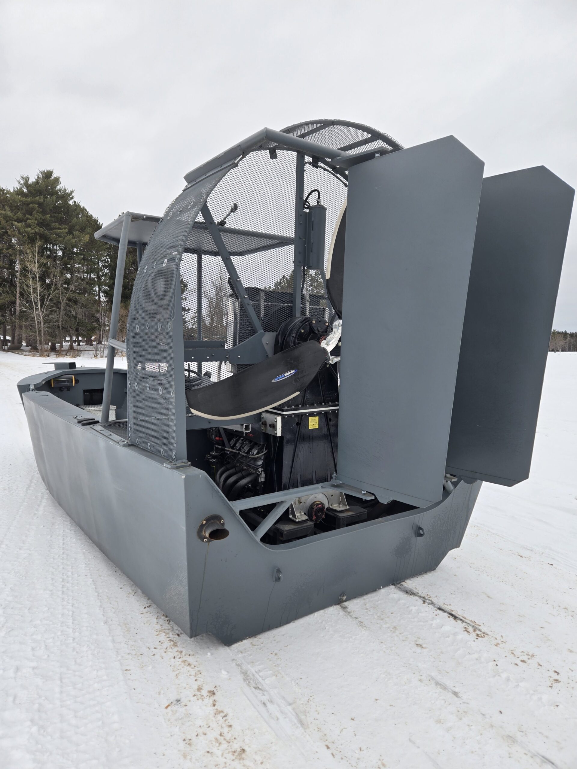 She is a 23-foot custom shallow-water boat for duck hunting or general marsh/flatland, remote, shallow, and challenging wetland environments. Ideal for soft ice conditions as well. It has a large propeller for navigating over vegetation, mud and ice, differing from amphibious military-style duck boats or wakeboarding boats, but focusing on ruggedness and shallow-water performance. The steering uses rear baffles controlled by the throttle; requires constant power for steering unlike traditional boats.
