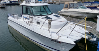 The 2680 Coastal Runner is a good-looking cat with a graceful profile and is a semi-displaced catamaran (rather than a planing cat) that offers a soft ride and fuel economy.  She has a weatherproof 6′ 5″ head room pilothouse which appeals to cold weather anglers.  The cockpit is designed with built-in tackle boxes, a 32-gallon livewell, in-deck fish boxes and under-gunwale rod holders.