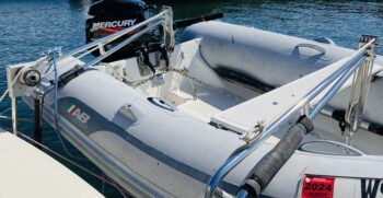 - AB Inflatable 9′ Dinghy with a Fiberglass Bottom and a Mercury 10 hp Engine with Trailer and St. Croix Davits