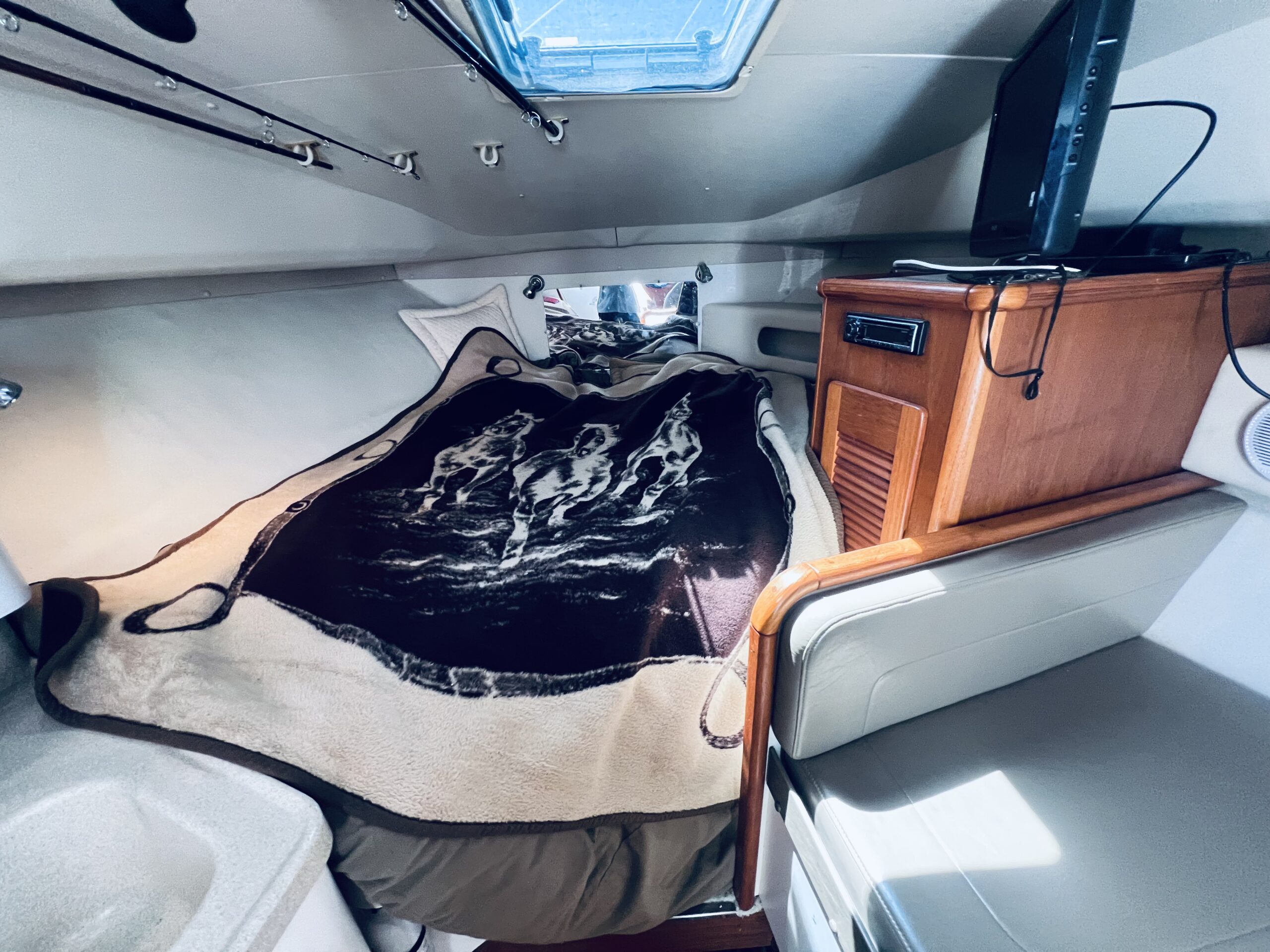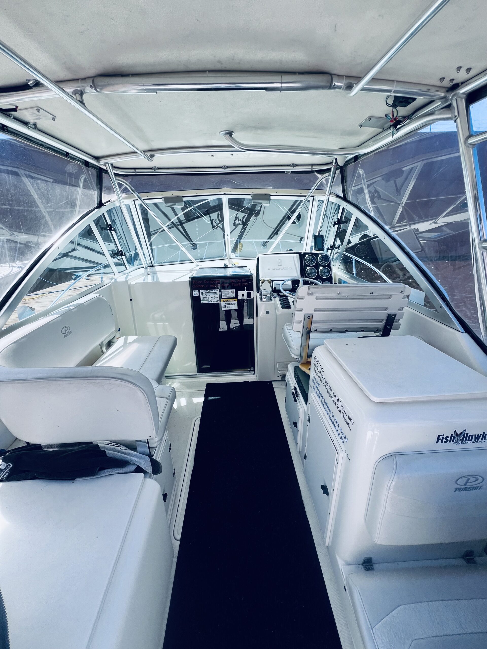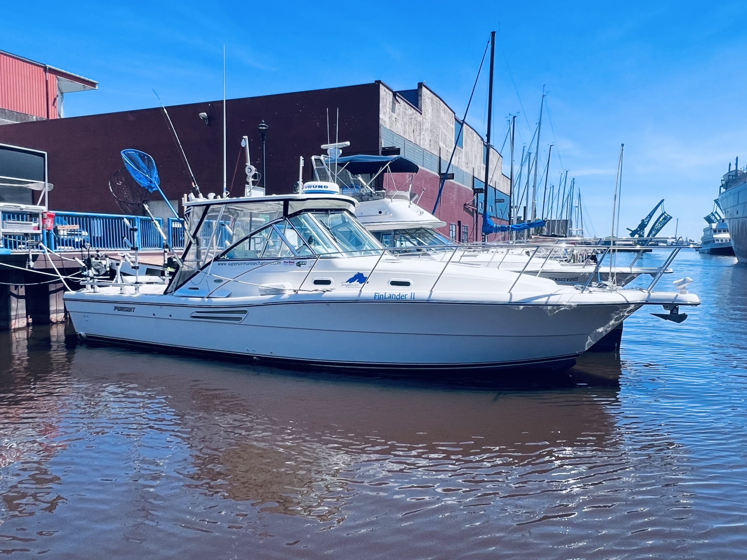 The Pursuit 3000 Express is a versatile performer that offers a smooth, dry ride even in the roughest weather. Designed to serve dual duty, she is both a rugged seaworthy fishing boat and an elegant cruiser. On deck, a wide-open cockpit with aft seating is perfect for entertainment, with an oversized windshield offering protection and clear sight lines. The fishing accouterments include tackle and general storage. Other standard features include stainless steel rod holders and racks under the gunwale, an insulated livewell and macerated fish box with overboard drain, fresh and raw water washdowns, and a hinged transom door. Belowdecks, there is generous headroom and a spacious dinette that converts to a six-foot, six-inch berth. The cabin features a fully equipped galley and a large double berth forward. A wide selection of fashionable fabrics, as well as teak finishes and optional teak and holly solid wood flooring provide a comfortable decor for the cabin.