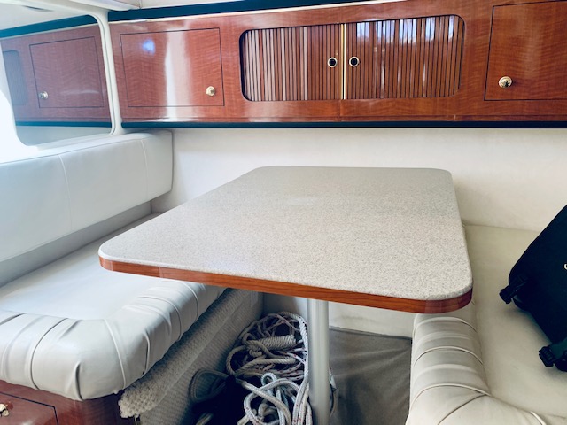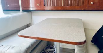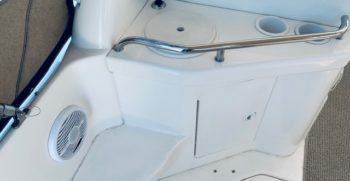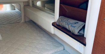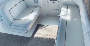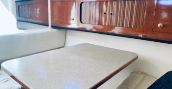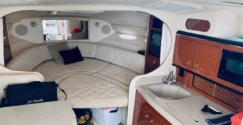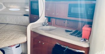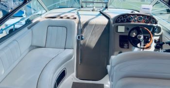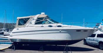 This Sundancer offers just about everything one could desire in a quality midsize family cruiser. Sea Ray always builds a solid boat, and at over 10,000 pounds, the Sundancer is no lightweight. The cockpit includes a port side sun lounge and a removable aft bench seat in addition to a very stylish helm console. Standard features include a cockpit shower and wet bar, excellent storage, a drop-down helm seat, and a transom door.