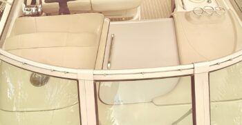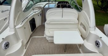Sexy, sleek and loaded with top-shelf amenities, the Sea Ray 300 Sundancer’s combination of quality and performance found a receptive market following her introduction in 2002. This is the fourth in a series of 300 Sundancer models from Sea Ray going back to the late 1980s. Like her predecessors, the Sundancer rides on a deep-V hull with moderate beam and a solid fiberglass bottom. There is a space-saving diagonal double berth forward, galley with large sink, microwave, and two-burner cooktop, and enclosed head with hand-held shower. Privacy curtains separate the sleeping areas from the main cabin. The Sundancer’s well-appointed interior is finished with earth-tone fabrics and attractive burlwood cabinets. The cockpit features a wet bar and removable table in addition to fore-and-aft facing bench seats. The cockpit sole lifts on hydraulic rams for engine access.