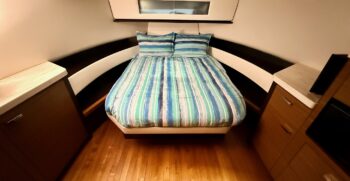 - Forward V-berth convertible to seating area