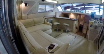 The 10.8 Meter Sedan is a stretched version of Trojan’s earlier 10 Meter Sedan model. The deck plans and interior layouts are essentially the same in both boats, the difference being the larger cockpit and additional fuel capacity of the 10.8 Meter. Although not specifically designed as a sportfishing boat, a transom door and tackle center were standard in the 10.8, and the enlarged cockpit has enough room for some serious fishing pursuits. The salon is a wide-open and spacious affair thanks to the boat’s wide beam. The engine room, however, is a tight fit. Topside, the flybridge – whose overhang shades the forward part of the cockpit – is arranged in the conventional manner with guest seating forward of the helm. Narrow side decks require care when accessing the foredeck.